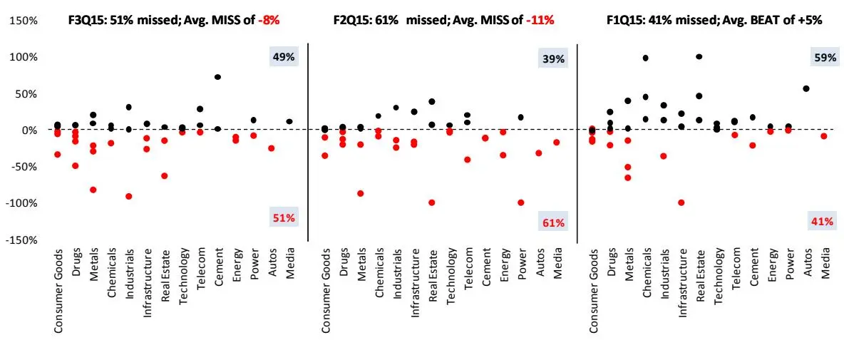 Note: Earnings performance above only includes BSE 100 names that had clear consensus history throughout F2015 (Mar) YTD. Source: Thomson Reuters