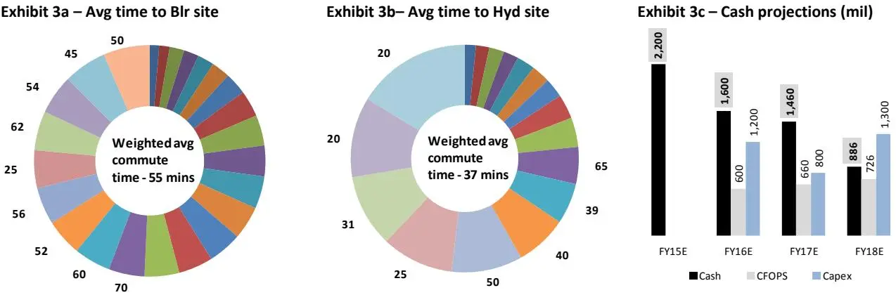 By our estimate, this business would end F2015 (Mar) with liquidity in the neighborhood of INR 2.3 Bil. Barring timing mismatch of operating cash flows and project requirements, current cash position and ongoing cash flows seem more than adequate to fund Hyderabad and Chennai parks (see Exhibit 3c). While we haven’t factored in incremental cash flows of Hyderabad park, its worth noting that the Bangalore park was cash flow positive in its first year itself. This was despite the fact that Bangalore’s launch took place amidst significant publicity headwinds associated with Happyland closure in that city.