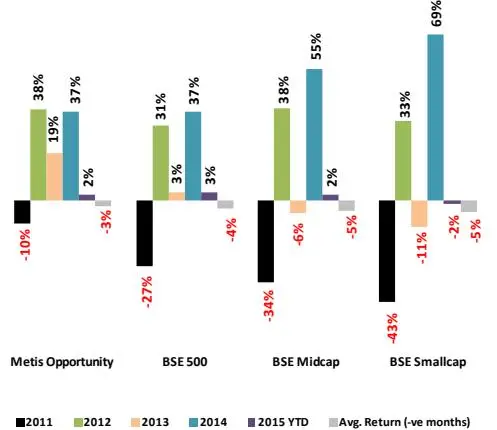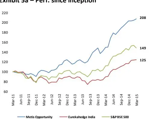 Since inception in April 2011, Metis Opportunity is up +107.9% vs. +45.5%, +48.6%, +54.1%, +33.2%, and +24.6% increases in Nifty, BSE 500, BSE Midcap, BSE Smallcap, and Eurekahedge India respectively.