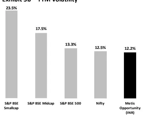 Over the last year, Metis Opportunity is up +39.0%. That compares with +26.7%, +33.2%, +49.5%, +54.0%, and +38.7% increases in Nifty, BSE 500, BSE Midcap, BSE Smallcap, and Eurekahedge India respectively. Over this period, our volatility was 28 bps, 108 bps, 531 bps, and 1128 bps below that of Nifty, BSE 500, BSE Midcap, and BSE Smallcap respectively.
